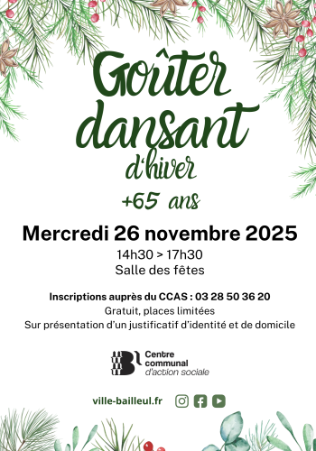 Le CCAS de Bailleul invite les Bailleuloises et Bailleulois âgés de 65 ans et plus à partager un moment convivial lors du goûter dansant d’hiver.